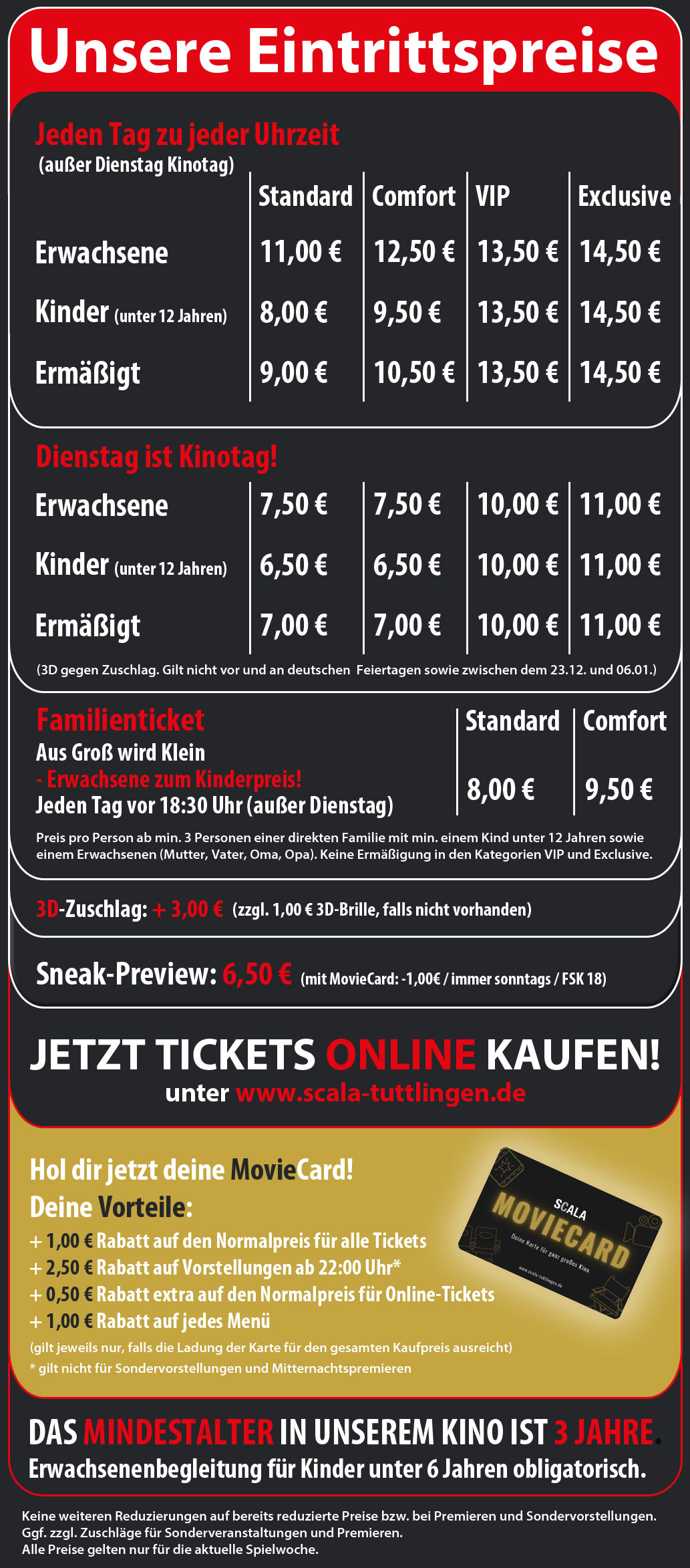 Wir öffnen täglich 30 Minuten vor der ersten Vorstellung.